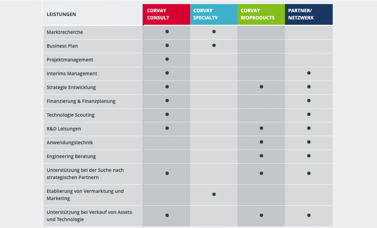 Corvay ist Ihr Systemanbieter für Leistungen entlang der Wertschöpfungskette der Bioökonomie. Von der Entwicklung über Marketing & Vertrieb bis zur Gründung neuer Unternehmen.